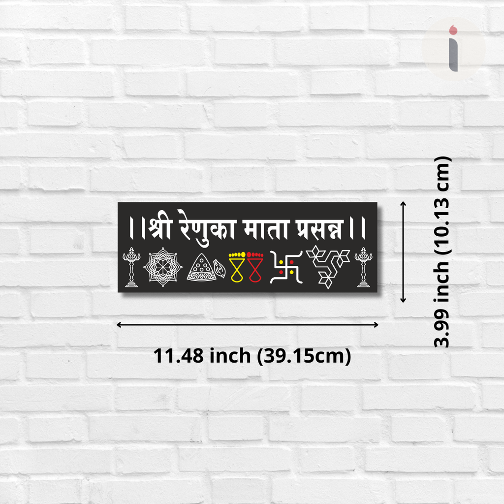 The powerful name of Renuka Mata is elegantly inscribed in bright white Sanskrit lettering on a deep black background, creating a striking and devotional aesthetic. Surrounding the inscription are intricately illustrated sacred symbols such as Trishul, Kalash, Shree Yantra, Swastik, Damaru, Cow & more, each representing purity, protection, prosperity and spiritual power. These symbols collectively enhance the presence of divine energy in your space.