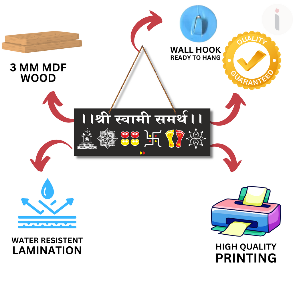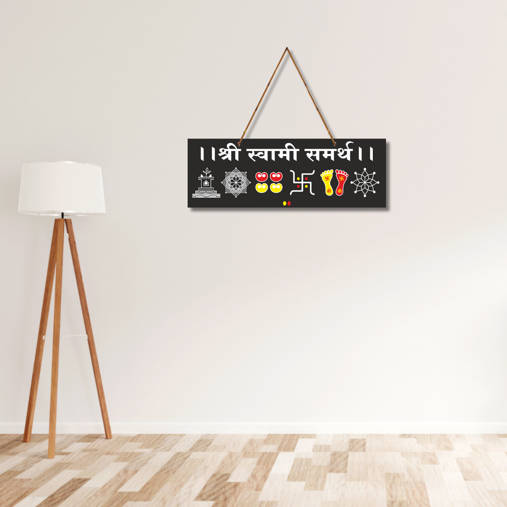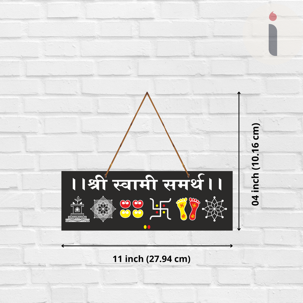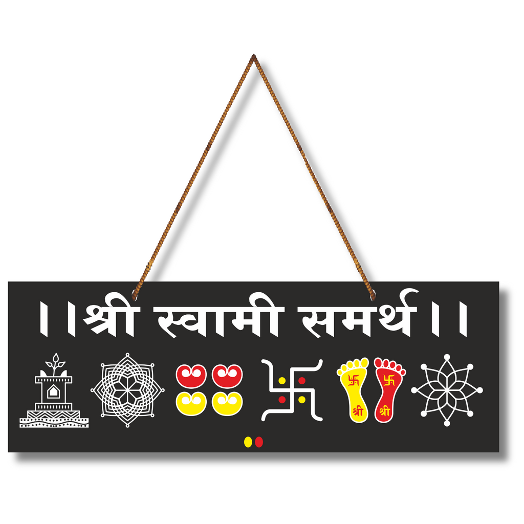 Invoke the blessings of Shree Swami Samarth with this traditional wall hanging featuring the revered inscription “श्री स्वामी समर्थ” in bold Devanagari script. Designed on a black base, the plaque is adorned with sacred pujan symbols like Swami paduka (footprints), Swastik, yantras, haldi-kumkum motifs, and mandir illustrations, all in vibrant red, yellow, and white.