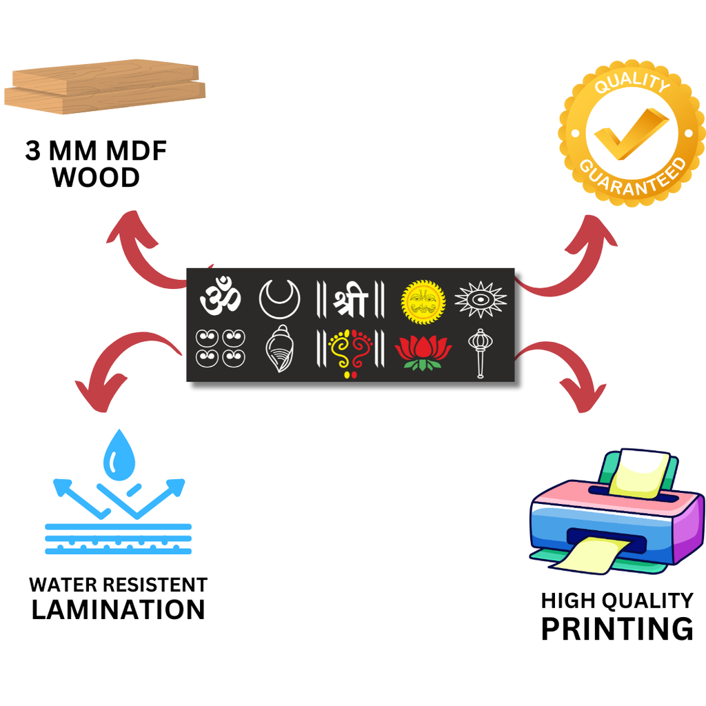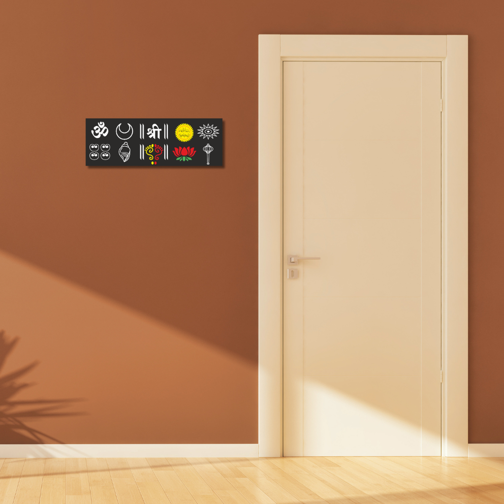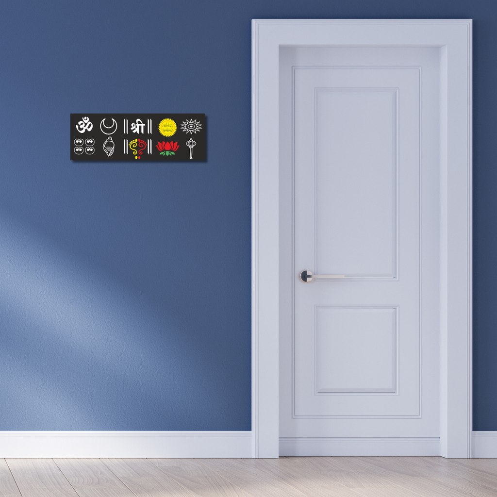 Set against a deep black background, the crisp white line art paired with selective touches of color enhances the artistic beauty of every symbol. The design exudes serenity and sacred energy, making this wall plate a perfect addition to your main entrance, pooja room door, meditation area, mandir wall, office entryway, or living space. The collection of symbols represents different aspects of cosmic harmony — from purity and prosperity to wisdom, protection and spiritual awakening.