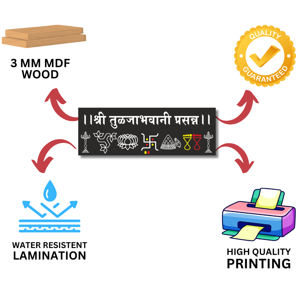 Shri Tulja Bhavani is worshipped as the protector of devotees, the destroyer of negativity, and the giver of strength, courage, and success. Placing this name plate at your entrance brings motherly protection, peace, and prosperity to your home. Every glance at it fills the surroundings with a sense of safety, devotion, and spiritual warmth.