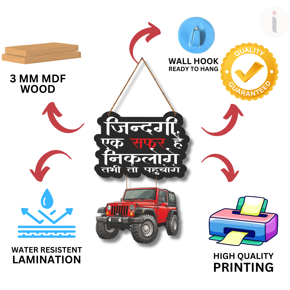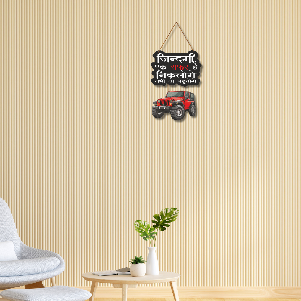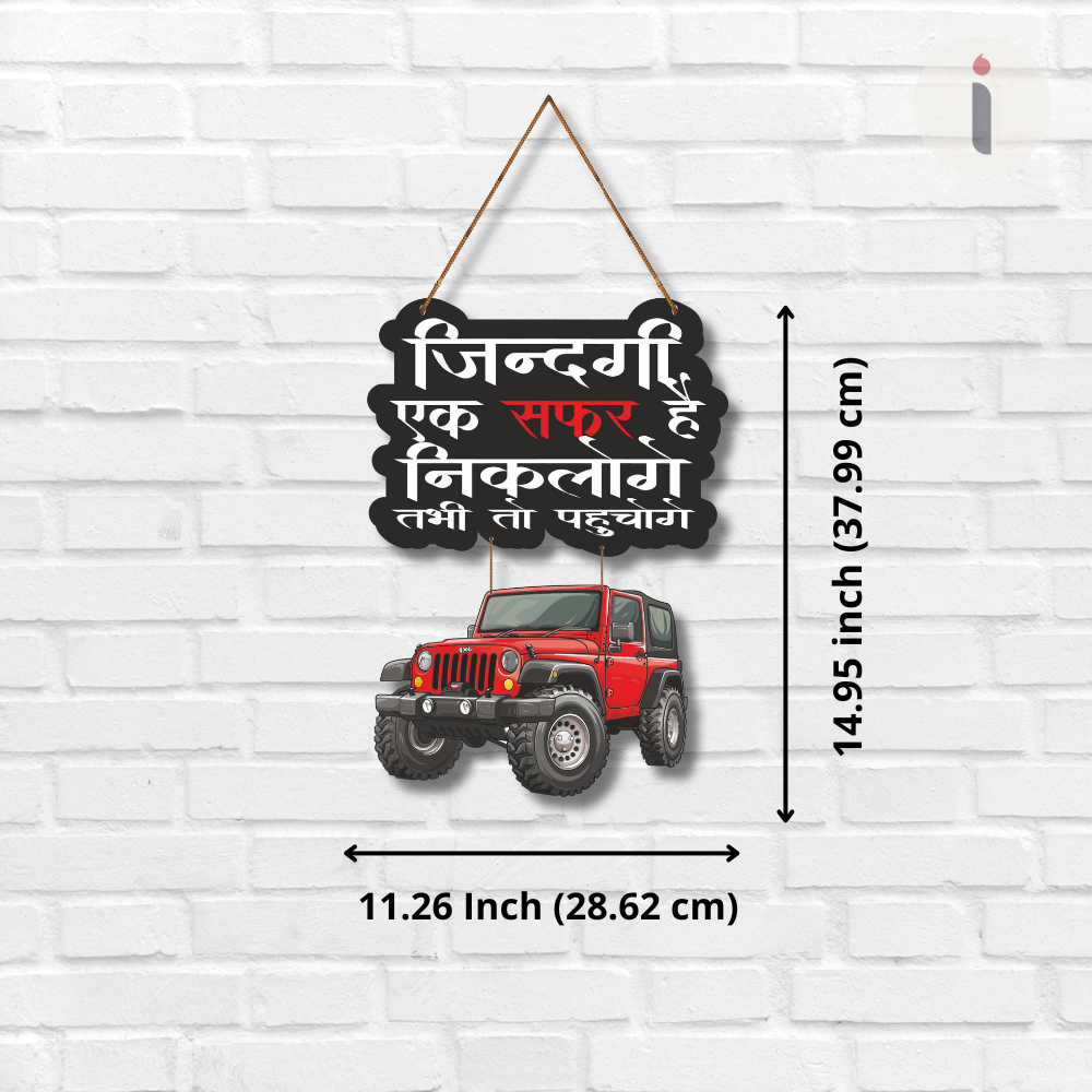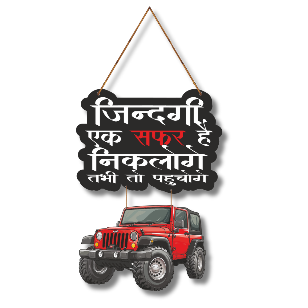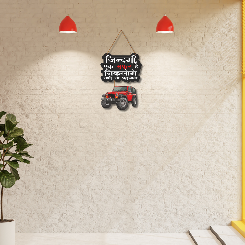 This stylish wall hanging with a bold jeep design carries the inspiring Hindi quote “Zindagi ek safar hai, nikaloge tabhi to pahunchege,” meaning life is a journey, you must set out to reach your destination. Perfect for travel lovers and adventure seekers, it adds motivation and character to living rooms, offices, or car enthusiasts’ spaces.