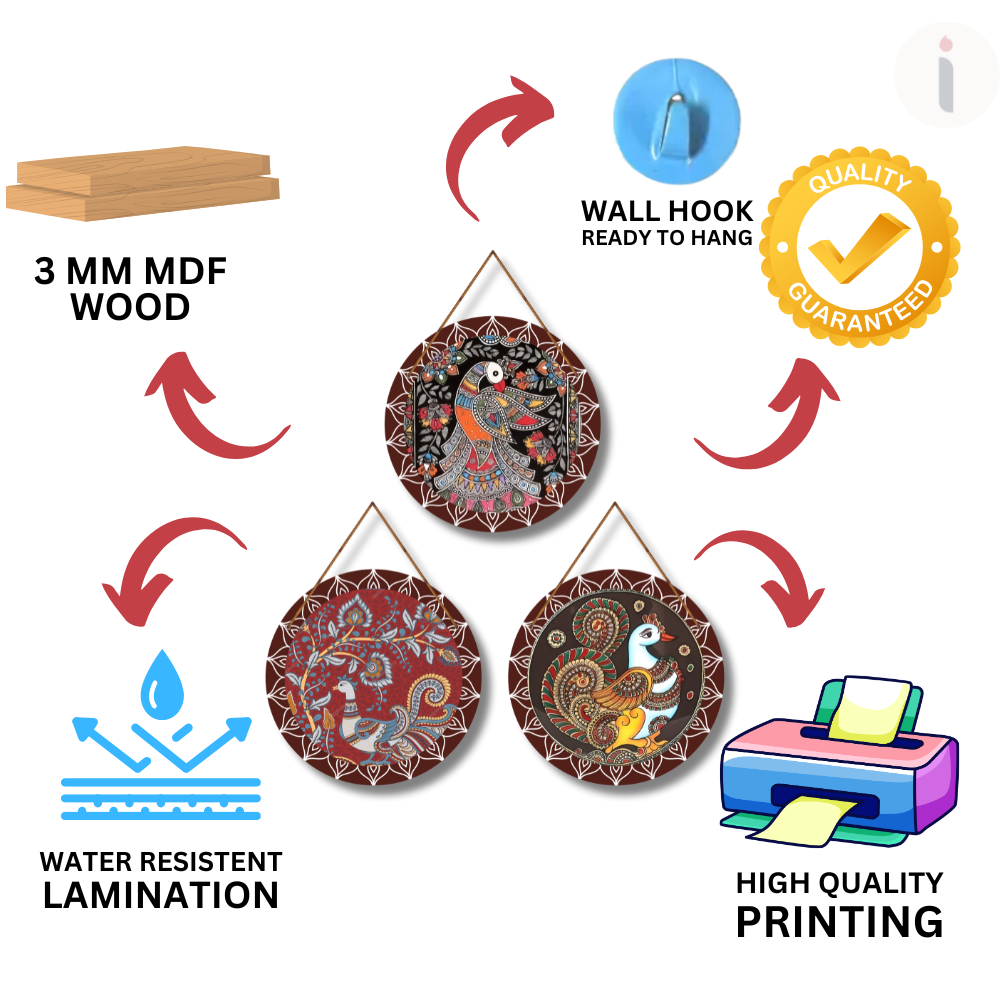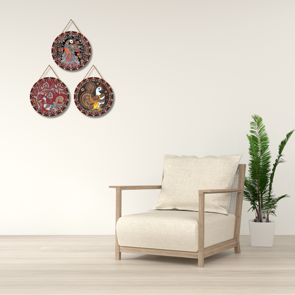 Enhance your walls with this exquisite set of Madhubani-inspired bird art hangings. Featuring intricate detailing and vibrant colors, each piece beautifully showcases traditional Indian folk artistry. Perfect for living rooms, bedrooms, or creative spaces, these wall hangings add a touch of culture, elegance, and charm, making them a unique décor choice or a thoughtful gift.