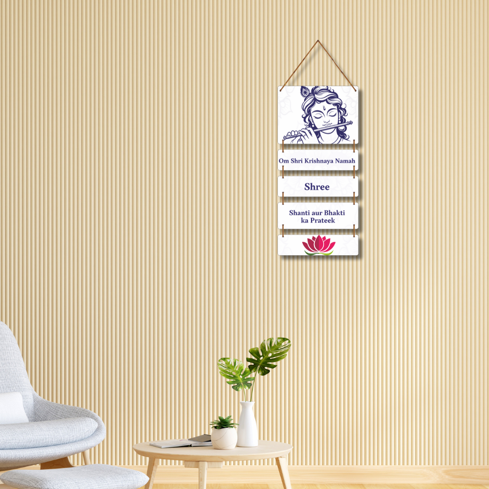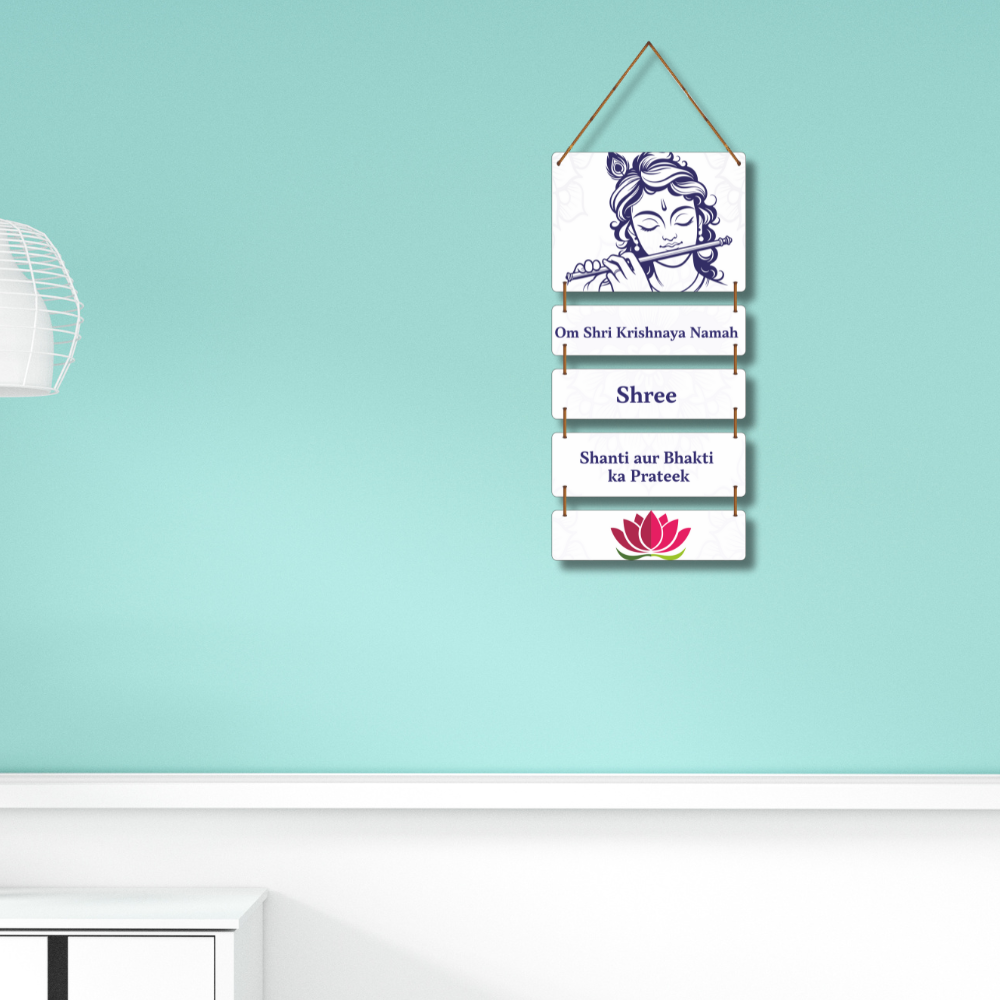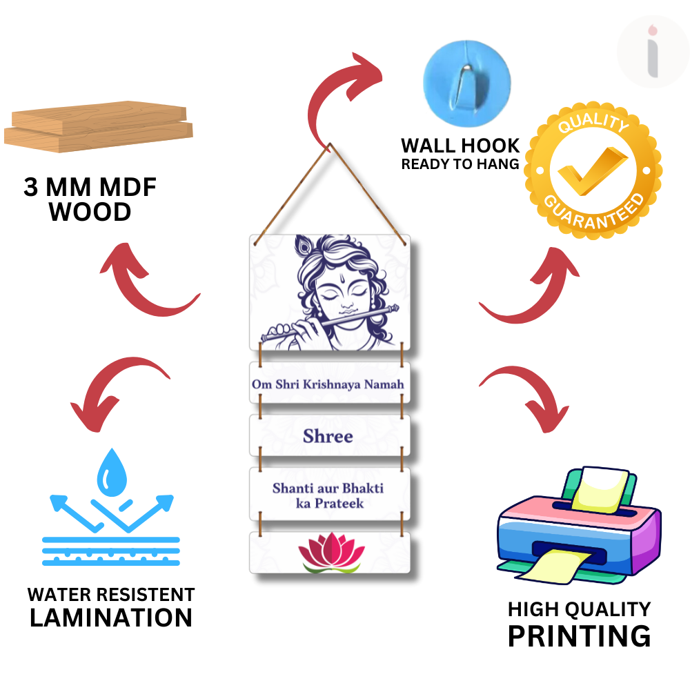 Enhance your home with divine charm through this Shri Krishna wooden wall hanging. Featuring the mantra “Om Shri Krishnaya Namah” along with a serene Krishna illustration, it symbolizes shanti and bhakti. Perfect for pooja rooms, meditation spaces, or gifting, this wall décor spreads positivity, devotion, and peace in every corner of your home.