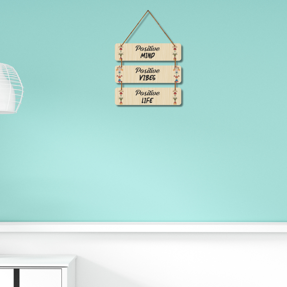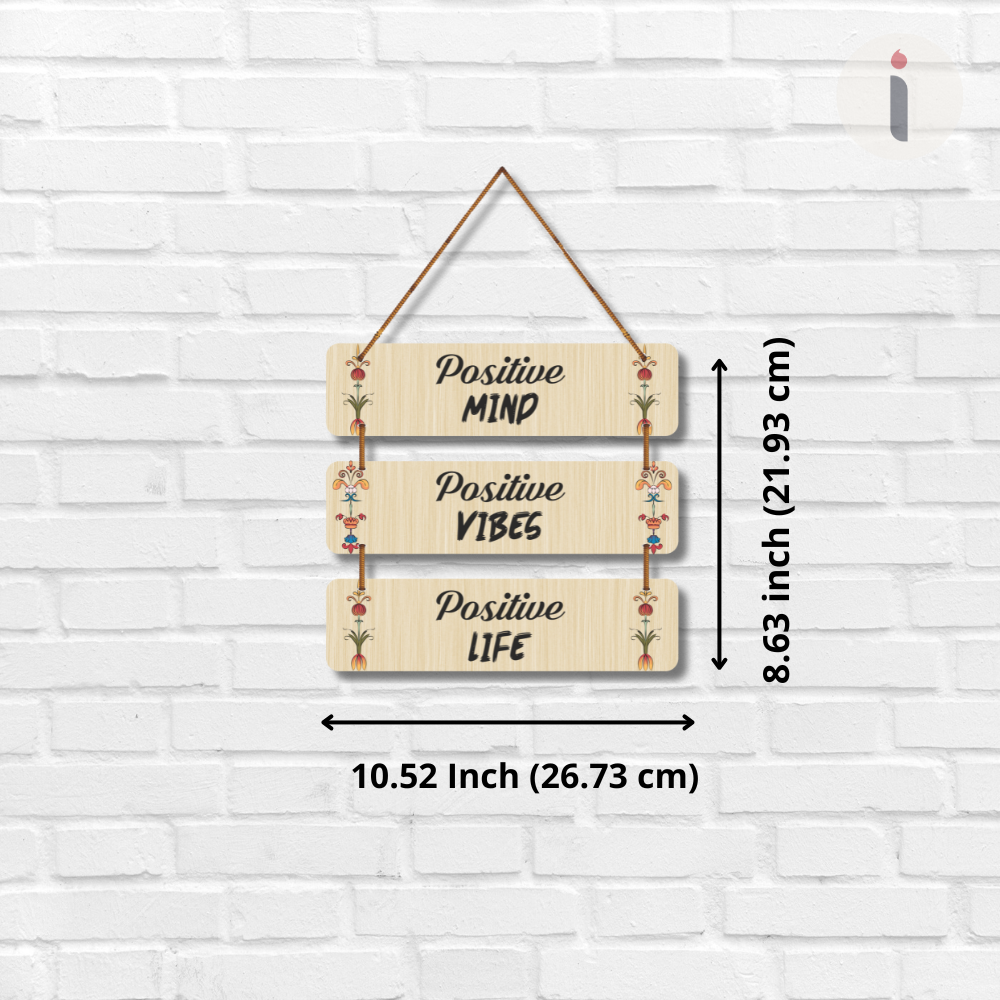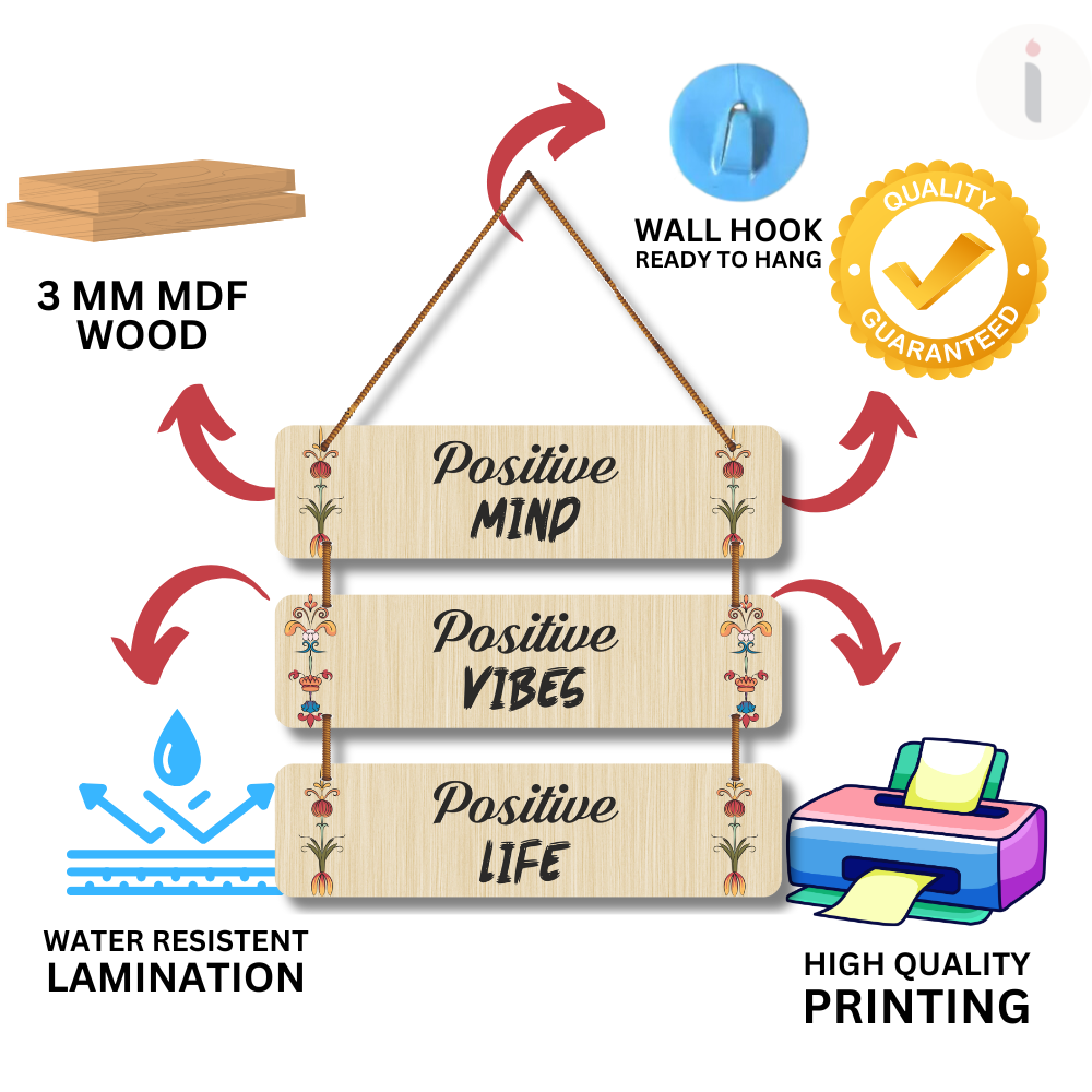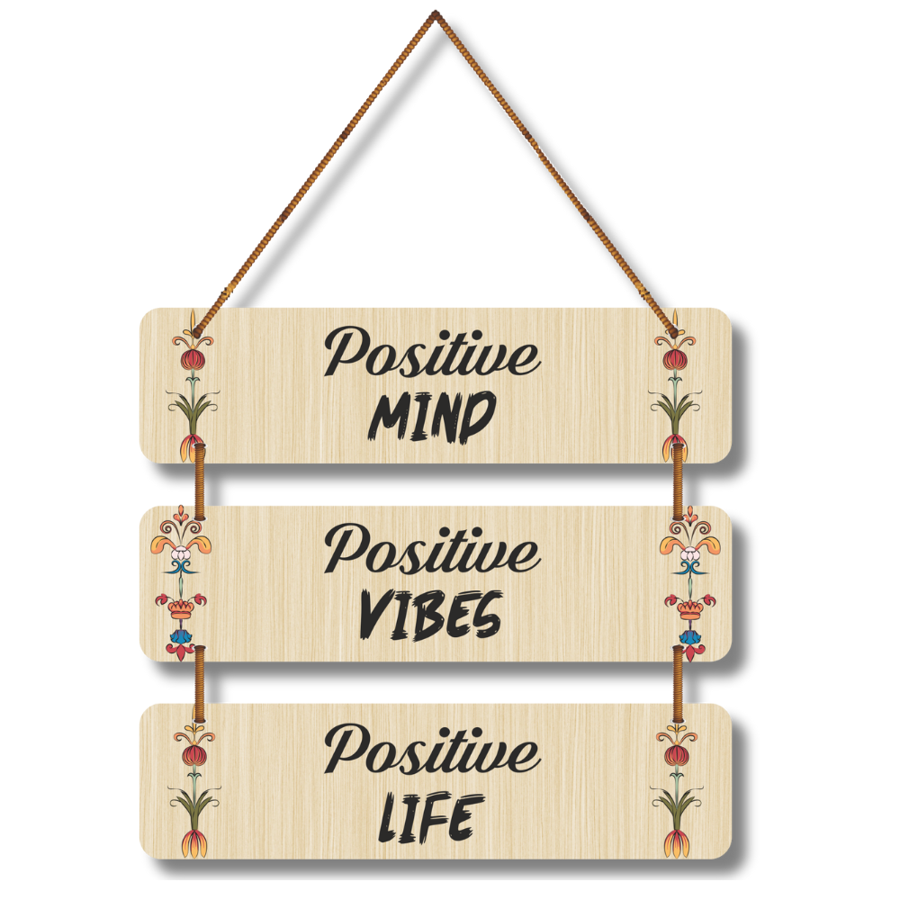 This inspirational wall hanging beautifully highlights the mantra of positivity—Positive Mind, Positive Vibes, Positive Life. Designed with subtle floral accents on a wooden texture background, it radiates warmth and motivation. Perfect for your home, office, or meditation corner, this décor piece encourages daily optimism, spreads uplifting energy, and creates a cheerful and harmonious environment.