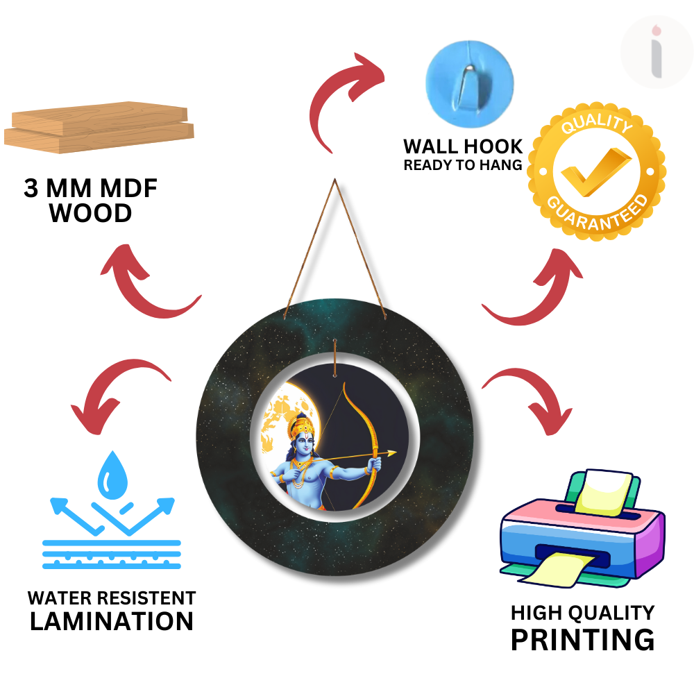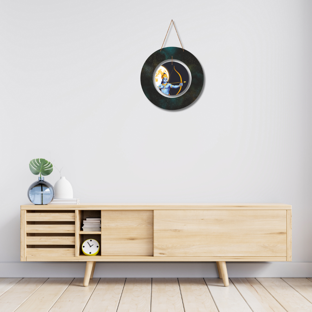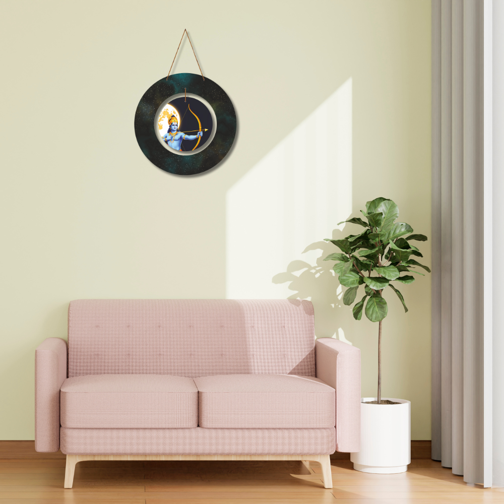 Channel the power, righteousness, and cosmic energy of Lord Shri Ram with this stunning wall hanging. Depicting Shri Ram in a poised archer stance with his golden bow and arrow, set against a mystical backdrop of the moon and star-lit galaxy, this artwork symbolizes divine focus, courage, and dharma.