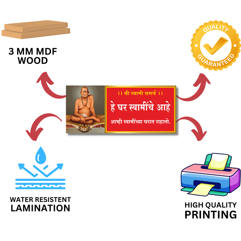 The left side of the name plate features a high-quality image of Swami Samarth, seated calmly in a divine posture that radiates peace, strength and blessings. The right side displays the beloved Marathi inscription “हे घर स्वामींचें आहे – आधी स्वामींच्या चरण रहातात”, reminding everyone that this home is protected, guided and blessed by the great saint.