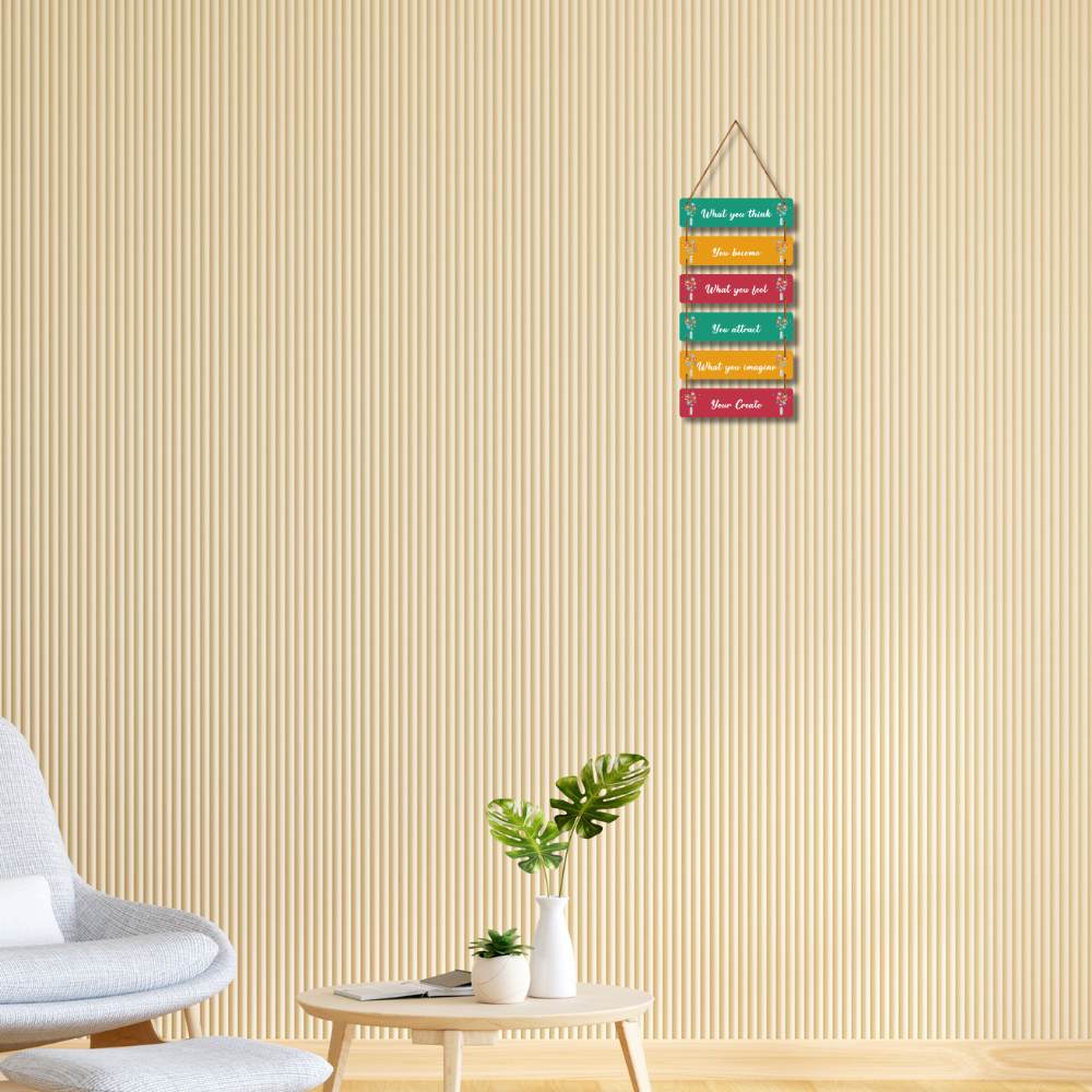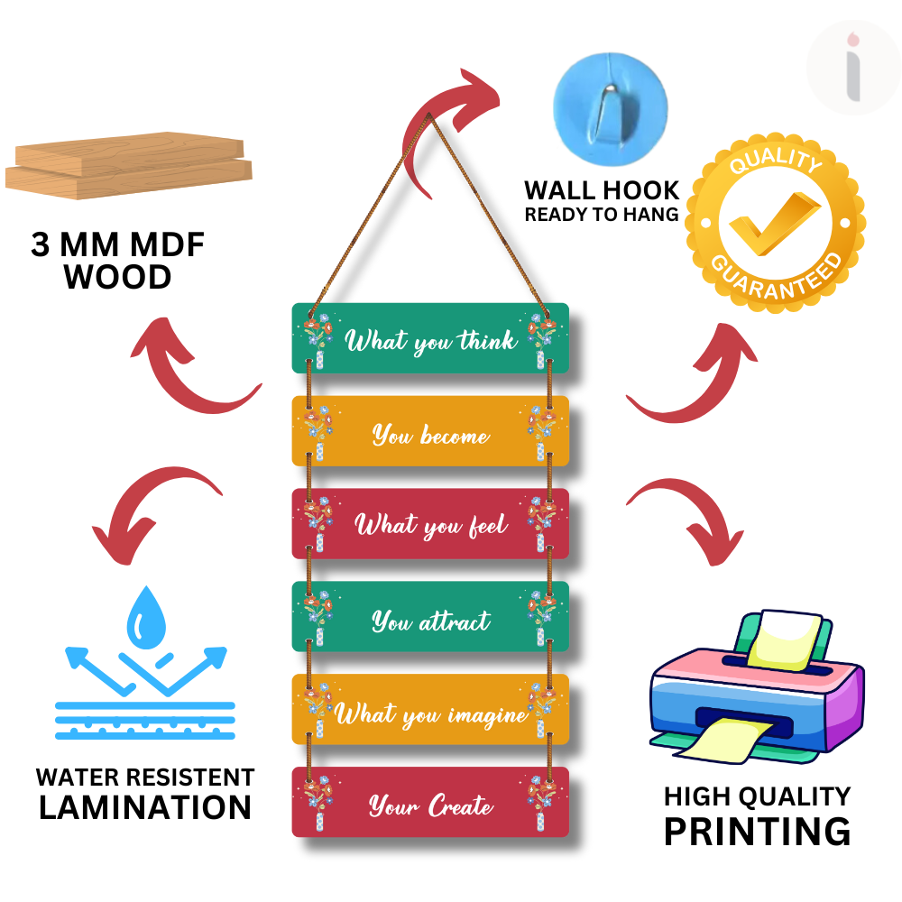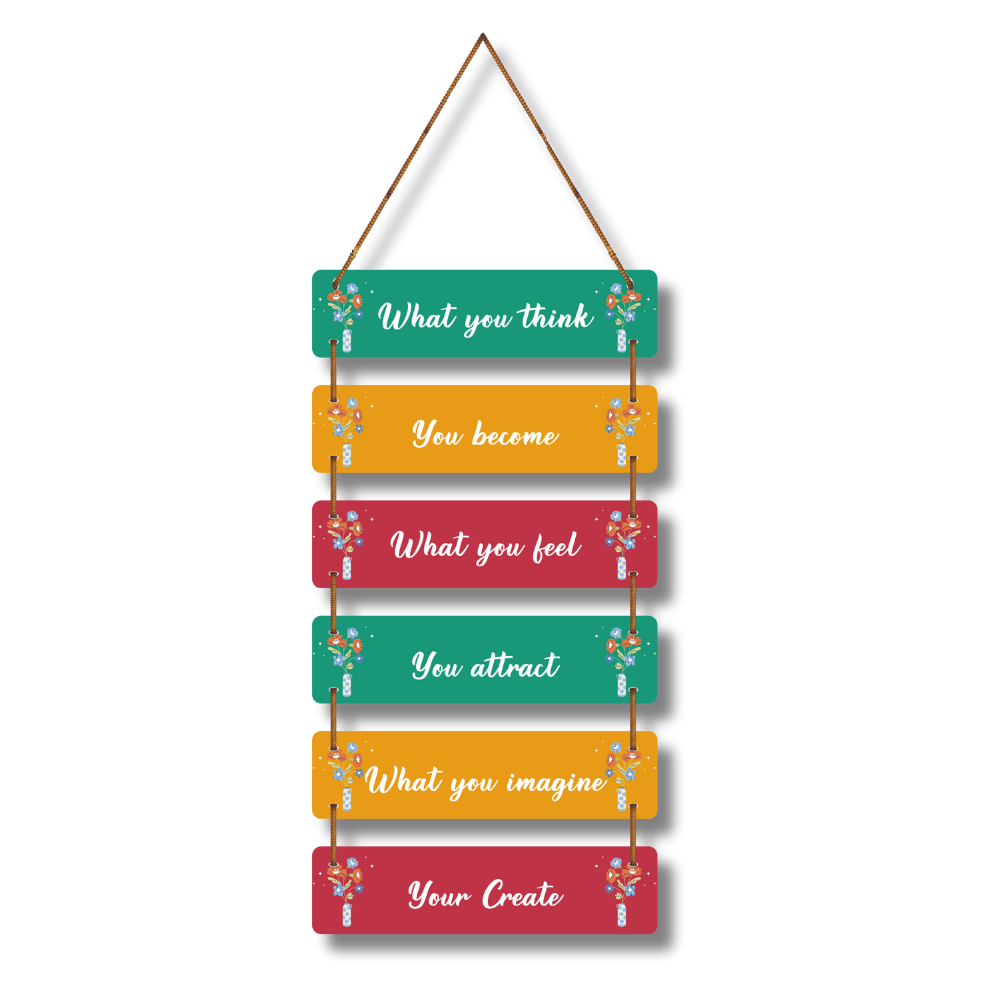 This motivational wall hanging beautifully conveys the power of positive thinking and belief. With quotes like “What you think, you become” and “What you imagine, you create”, it inspires mindfulness, creativity, and self-growth. Perfect for homes, offices, or study spaces, it serves as a daily reminder to align your thoughts, feelings, and imagination to shape your reality.