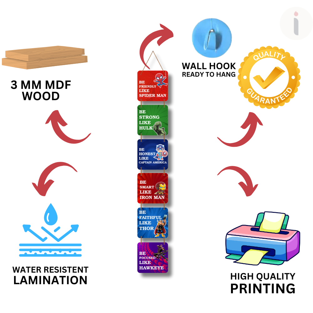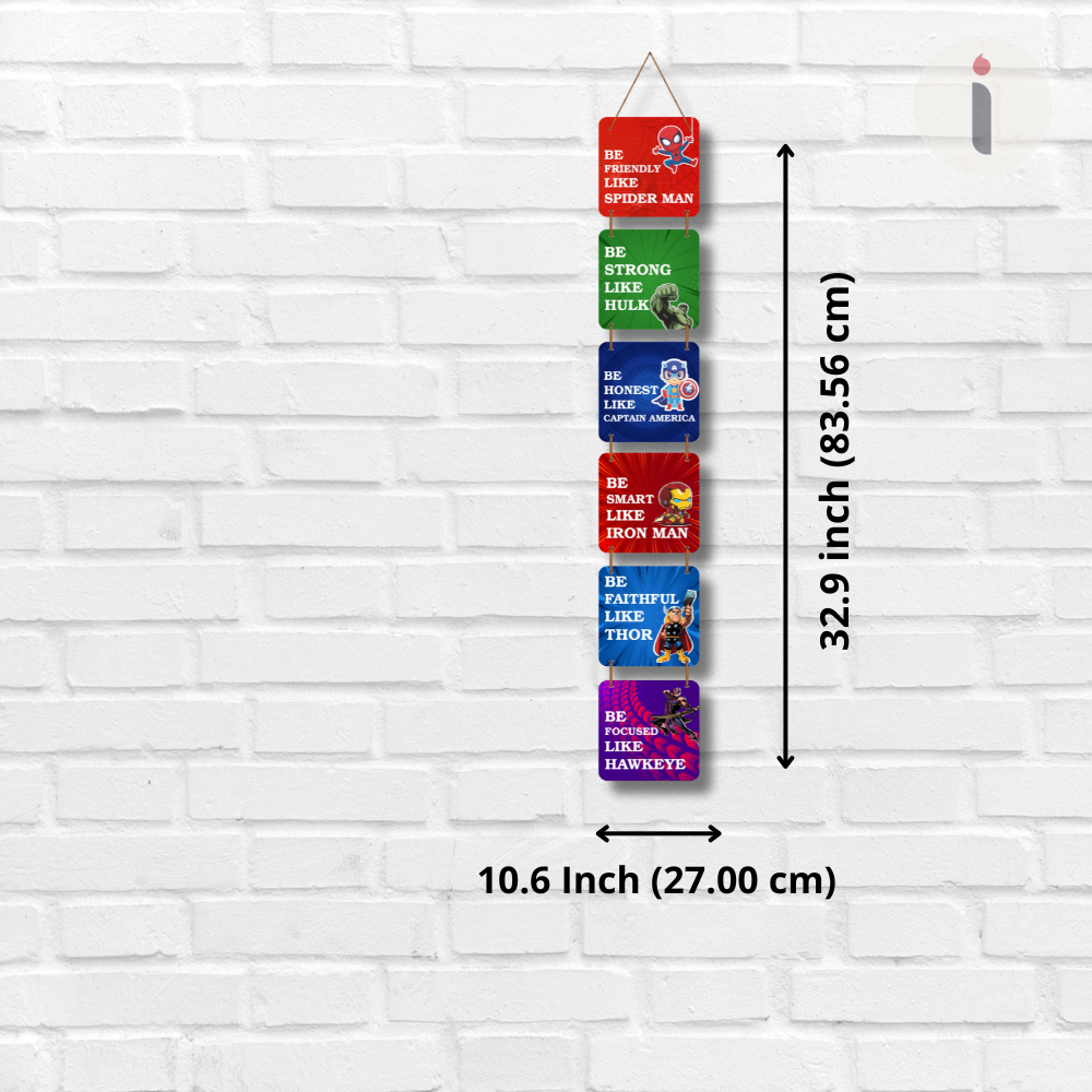 Bring home the spirit of your favorite superheroes with this vibrant wall hanging. Featuring motivational traits like Spider-Man’s friendliness, Hulk’s strength, Captain America’s honesty, Iron Man’s intelligence, Thor’s faith, and Hawkeye’s focus, it inspires kids and adults alike. Perfect for bedrooms, study areas, or playrooms, this décor piece adds fun, color, and positive energy to any space.