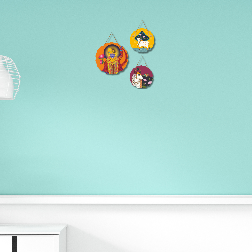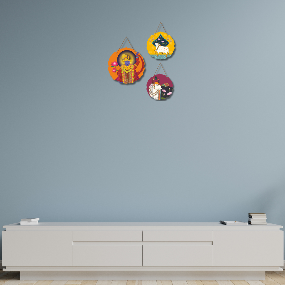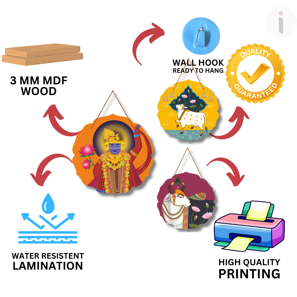 This graceful wall hanging set features Shrinathji with radiant detailing, accompanied by beautifully adorned sacred cows. Symbolizing devotion, purity, and divine grace, it captures the essence of Krishna bhakti and the holy bond with Gau Mata. Perfect for pooja rooms, living spaces, or gifting, this art piece brings blessings, serenity, and spiritual vibrance into any home.