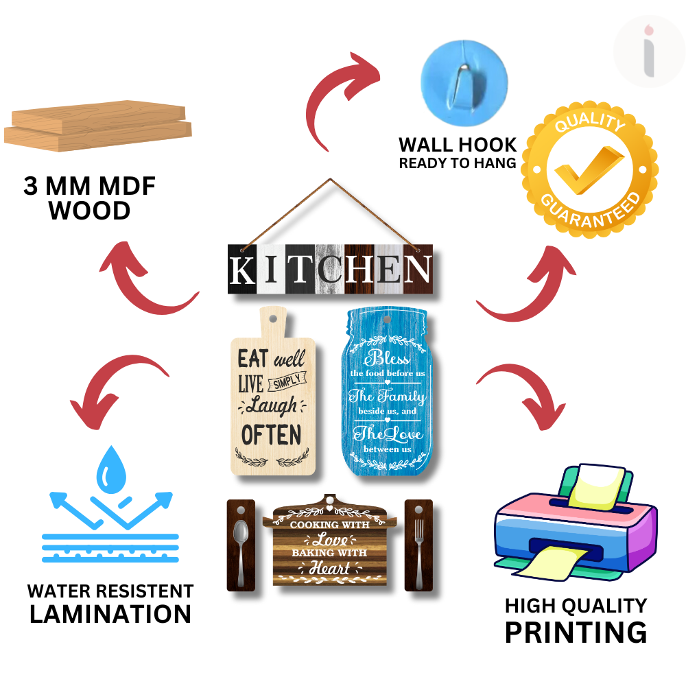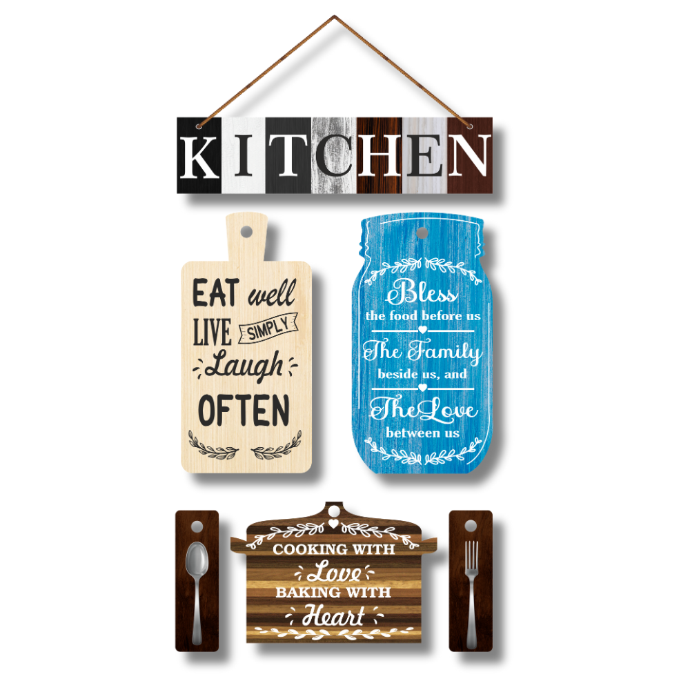 Warmth and charm to your kitchen with this rustic wall décor featuring cutting board and utensil designs. With motivational quotes like Eat Well, Live Simply, Laugh Often and Cooking with Love, Baking with Heart, it perfectly blends inspiration with farmhouse aesthetics. Ideal for kitchens, cafés, or gifting, it brings coziness and positivity to every meal.