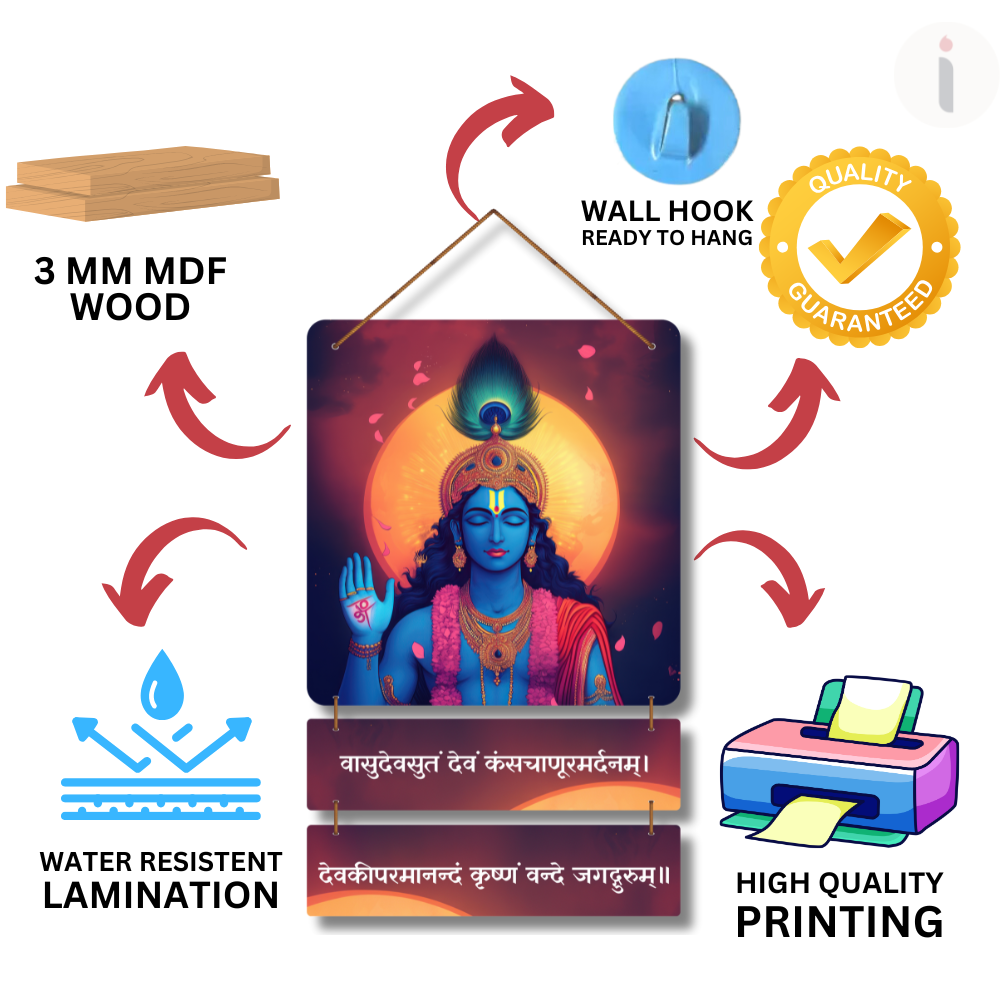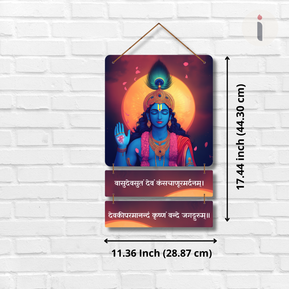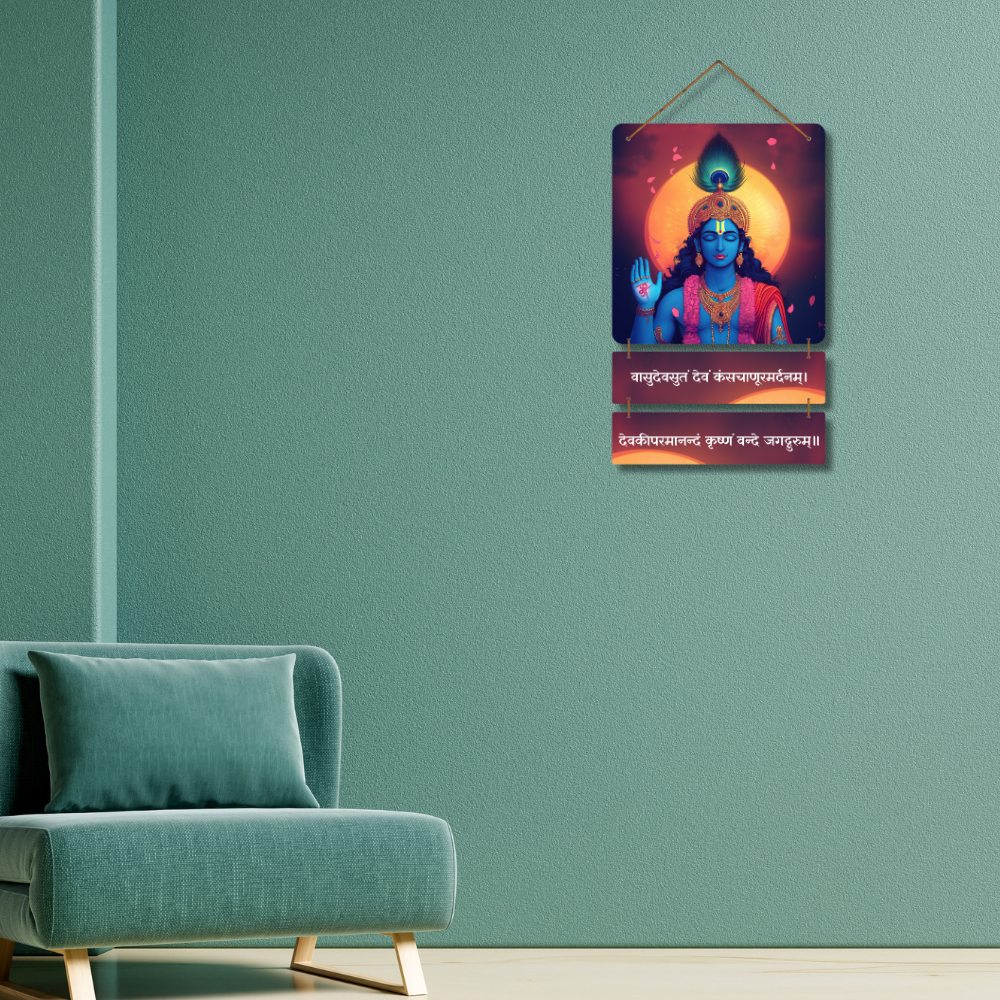 Invoke divine protection and serenity with this Vasudeva-Sutam Devam Wooden Wall Hanging 🙏💙. Adorned with a radiant image of Lord Krishna and sacred shloka, it symbolizes wisdom, compassion, and inner peace 🌸🕉️. Perfect for pooja rooms, living spaces, or gifting, this spiritual décor fills your home with positivity and devotional grace ✨🪔.
