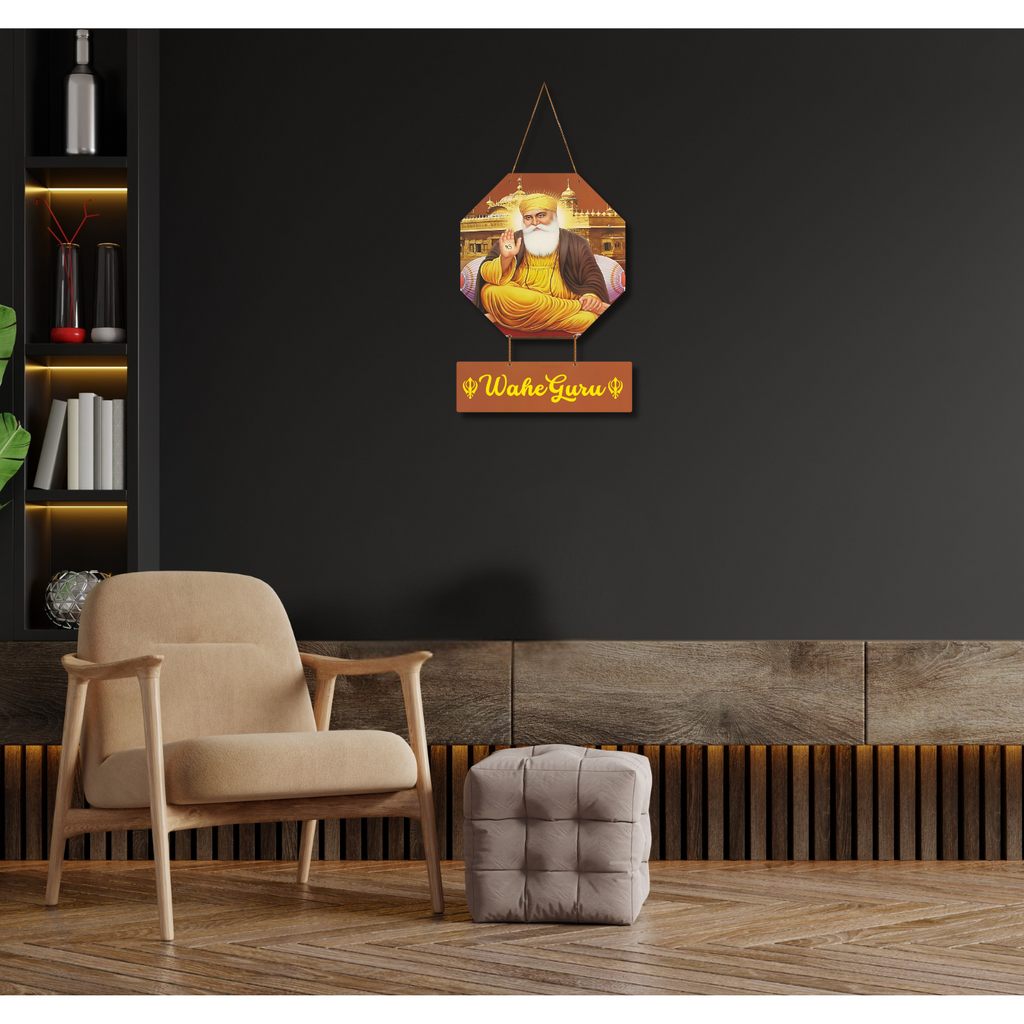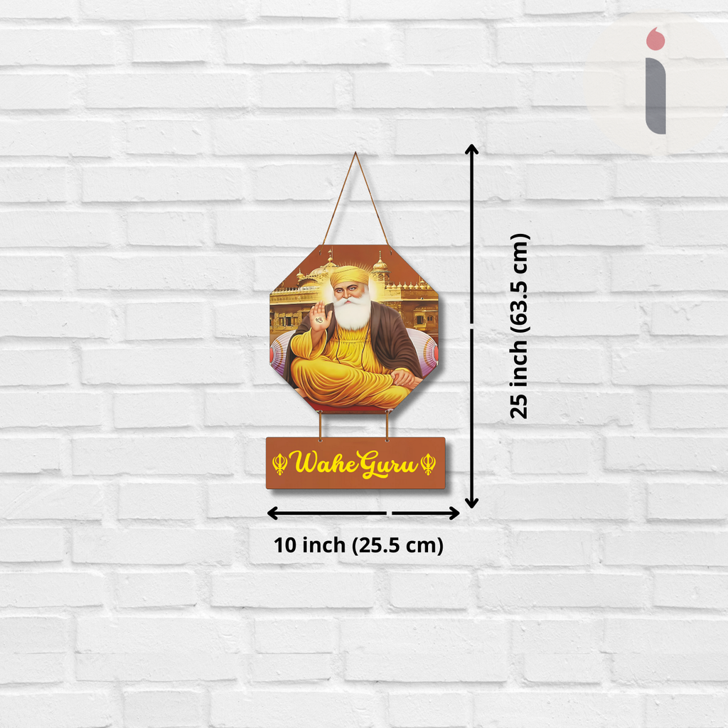 This sacred wall hanging features a divine portrait of Guru Nanak Dev Ji, radiating peace and spiritual wisdom, with the holy Golden Temple in the background. Below, the word “WaheGuru” is beautifully inscribed with Khanda symbols, symbolizing Sikh devotion. Ideal for homes, prayer areas, or gurdwaras, it brings blessings, serenity, and a deep spiritual presence.