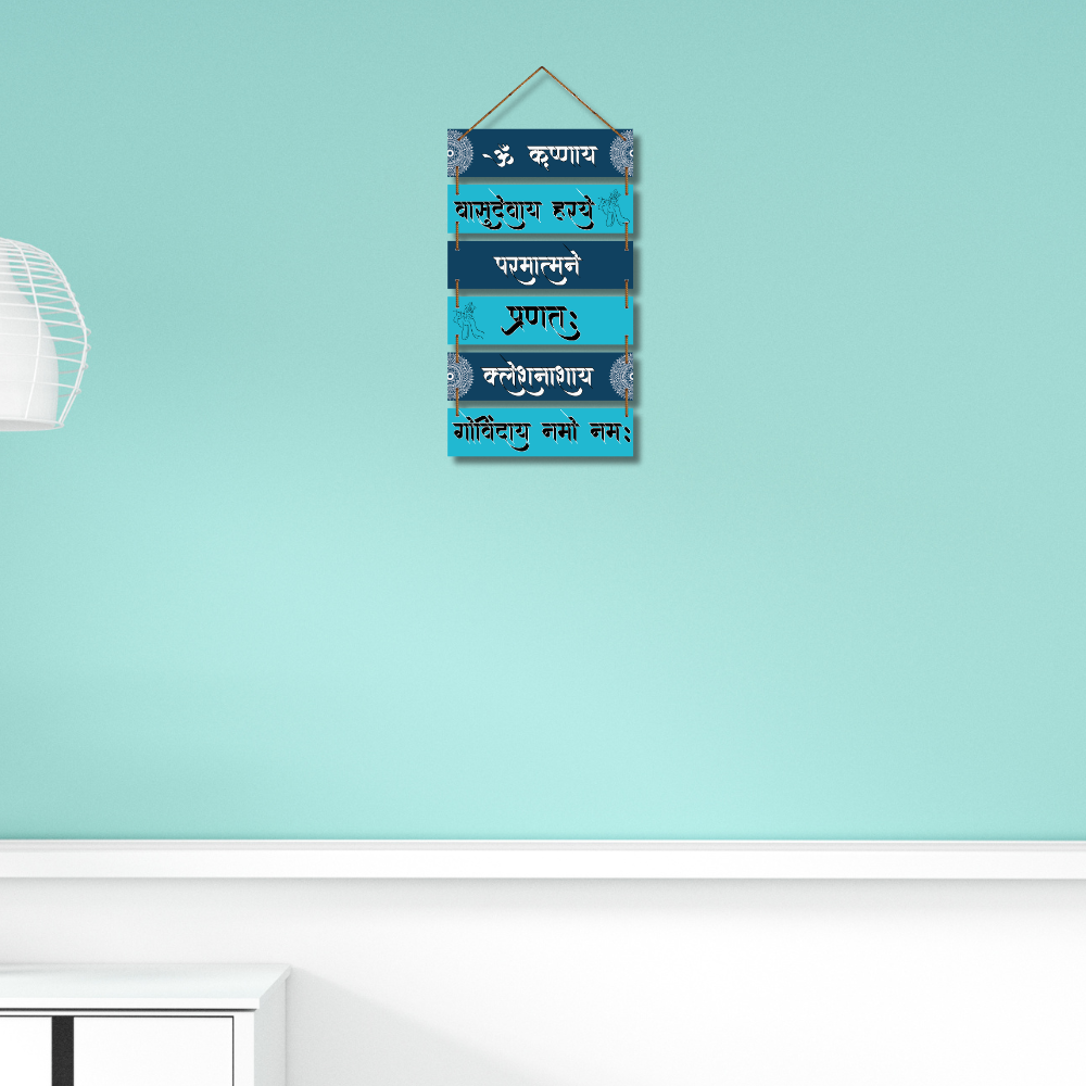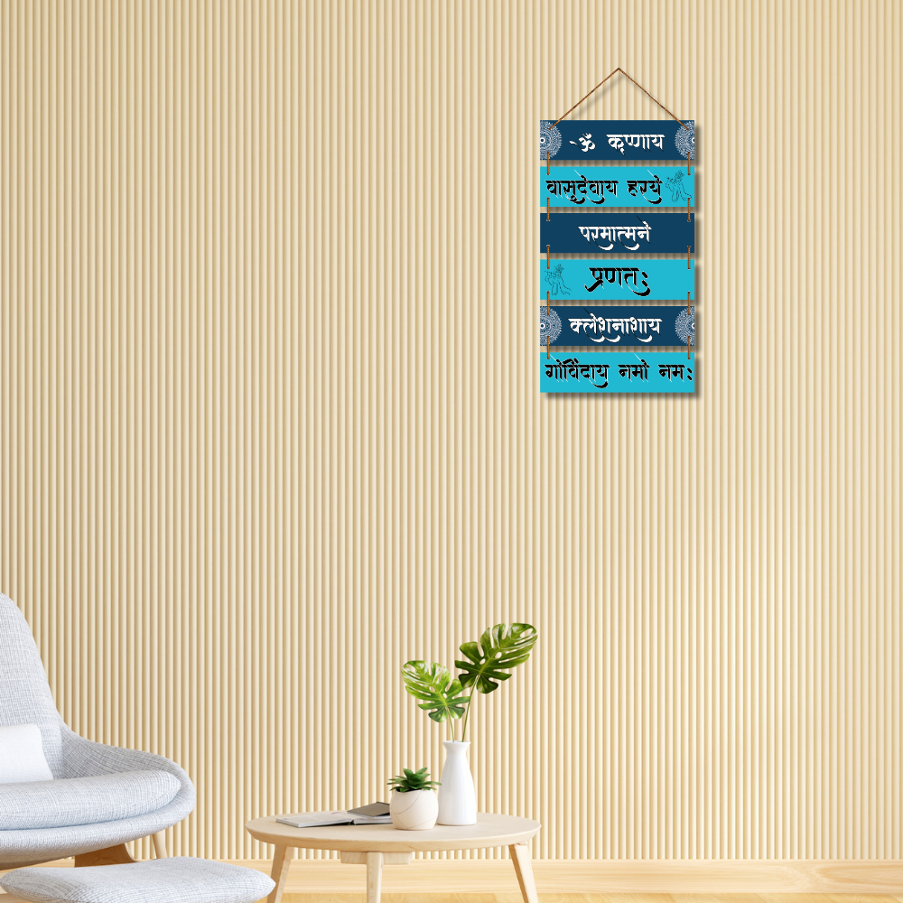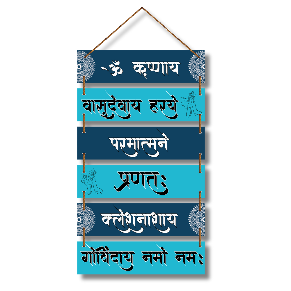 Elevate your living space with this beautifully designed Krishna mantra wall hanging, featuring sacred Sanskrit shlokas honoring Lord Krishna. Its vibrant blue tones and artistic detailing radiate peace, positivity, and devotion. Perfect for meditation rooms, prayer corners, or gifting, this piece brings divine blessings and a sense of calm to your surroundings.