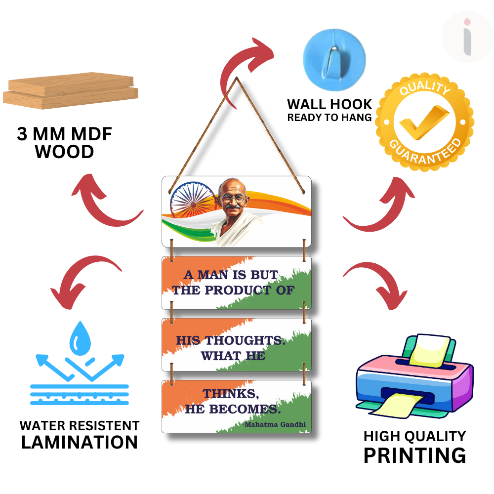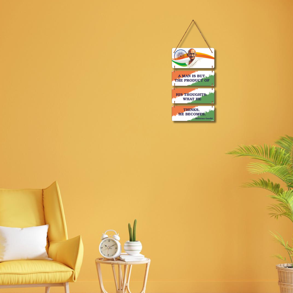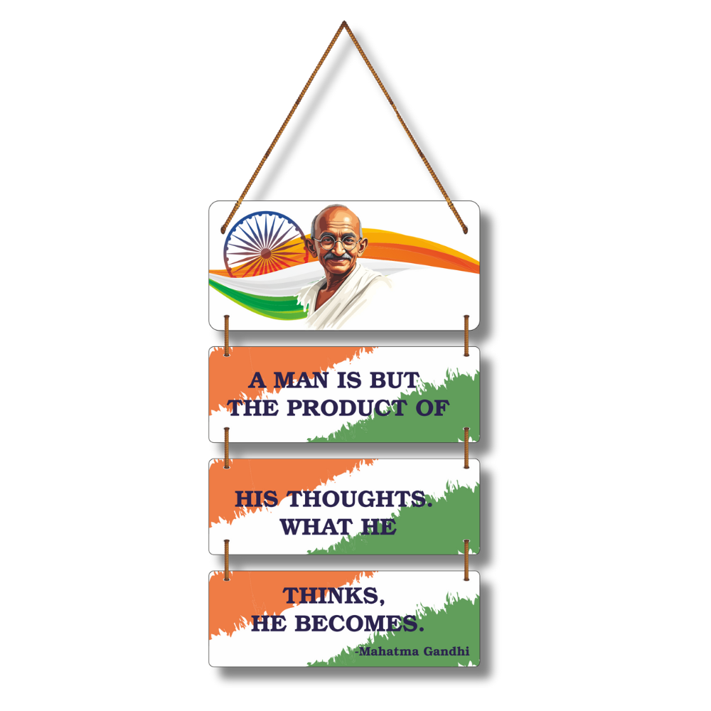This wall hanging features Mahatma Gandhi’s timeless words: “A man is but the product of his thoughts. What he thinks, he becomes.” Designed with the Indian tricolor and Gandhi’s portrait, it symbolizes wisdom, peace, and patriotism. A perfect décor piece for homes, offices, or study areas, it inspires positive thinking and reminds us of the power of thoughts.
