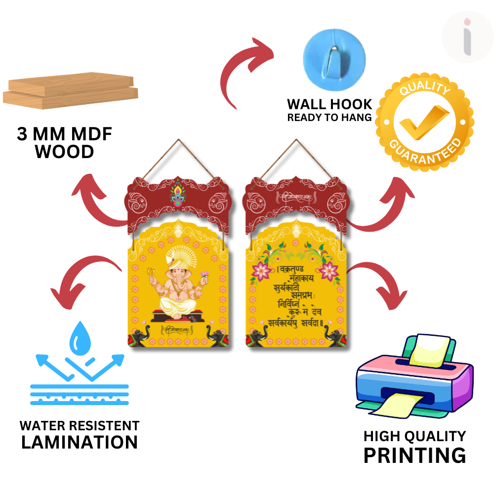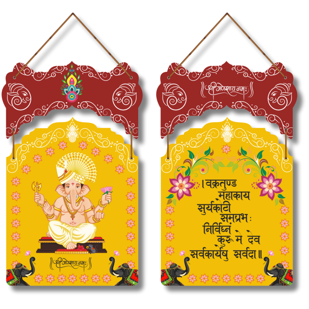 Invite prosperity and remove obstacles with this beautifully crafted double-sided Ganesh wall hanging. Featuring Lord Ganesha’s divine image on one side and the powerful Vakratunda Mahakaya mantra on the other, it radiates positivity and grace. Perfect for pooja rooms, entrances, or living spaces, it brings peace, wisdom, and auspicious beginnings to every home.