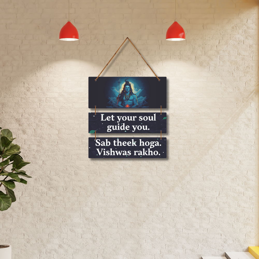strength and positivity to your space with this beautiful Lord Shiva wooden wall hanging. Featuring a serene Shiva artwork with inspiring quotes “Let your soul guide you” and “Sab theek hoga, vishwas rakho”, it radiates peace and faith. Perfect for meditation rooms, pooja corners, or gifting spiritual blessings.