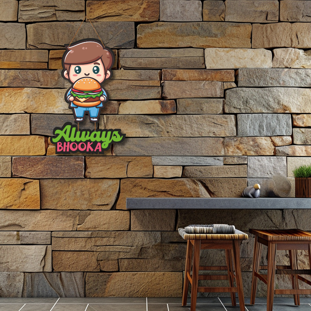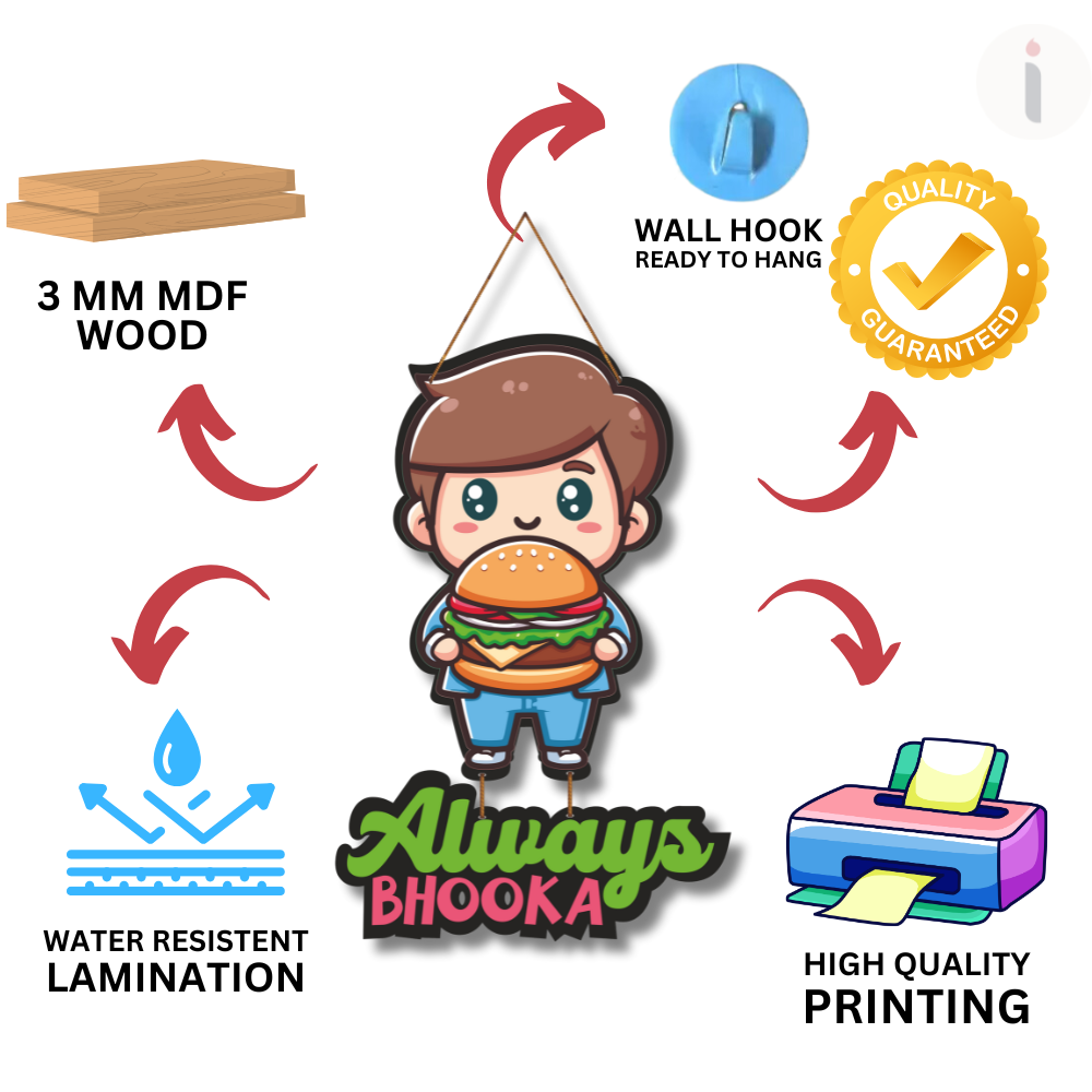 Add fun and humor to your décor with this quirky wooden wall hanging featuring a cute cartoon boy holding a giant burger with the phrase “Always Bhooka.” Perfect for kitchens, cafés, dining areas, or gifting to food lovers, this playful piece brings smiles and foodie vibes wherever it hangs. A must-have wall décor for every hungry soul!